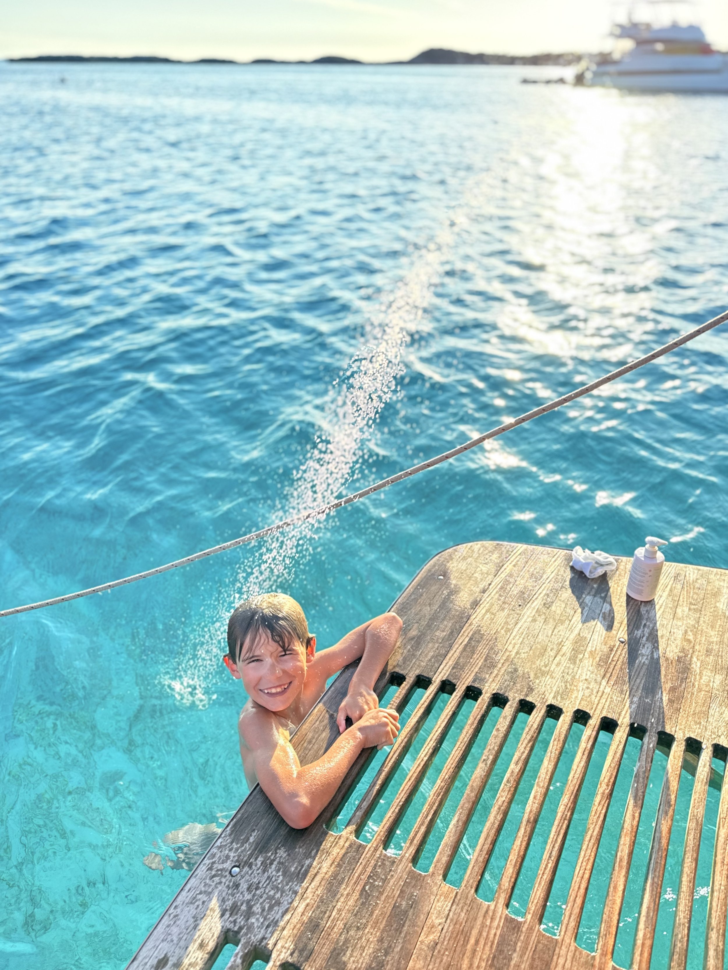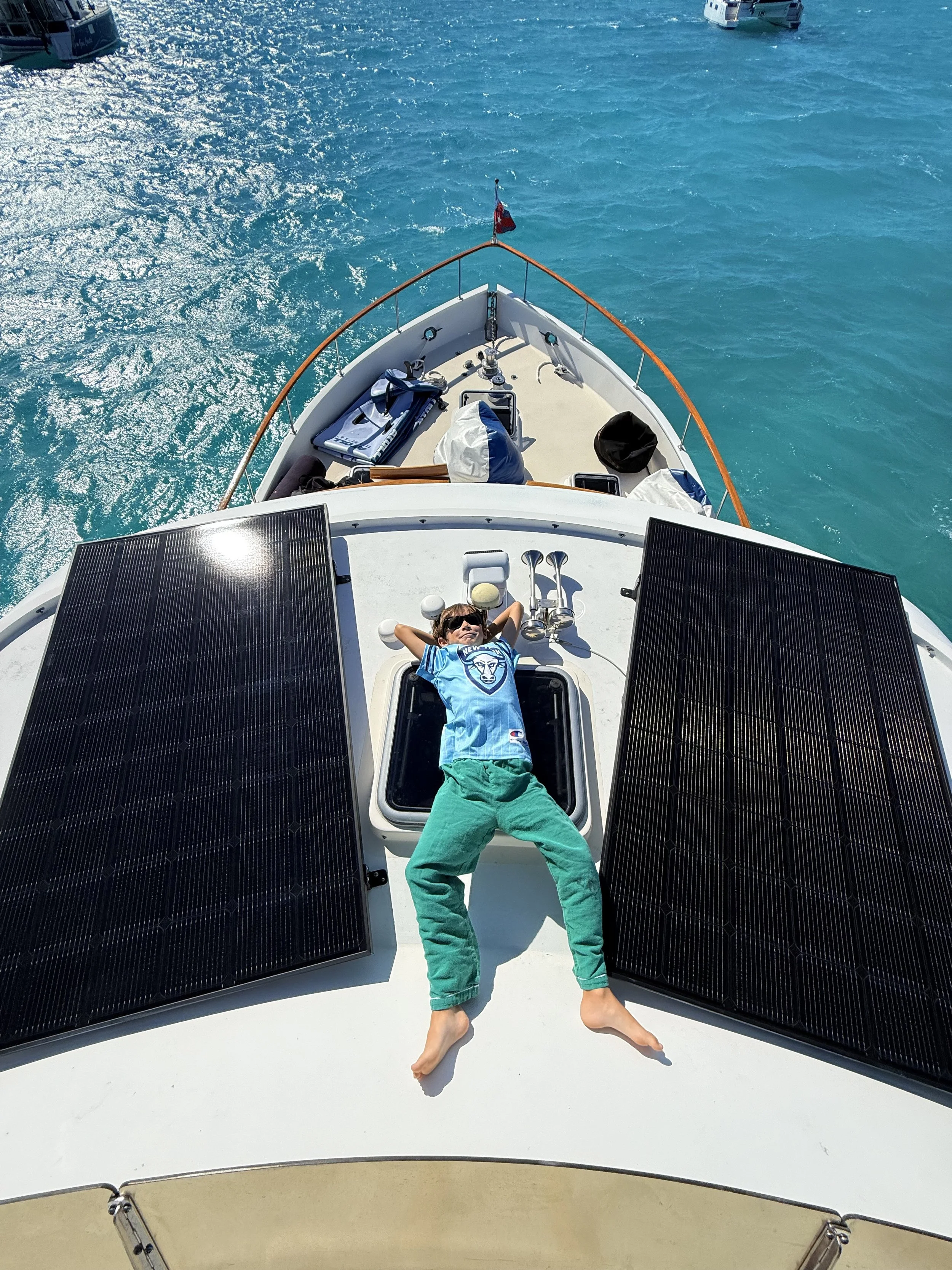 Electricity is another thing that must be conserved. We have solar panels, a wind generator and a diesel powered generator. When we are motoring we can make electricity through something called an alternator. We store the energy we make in a bunch of big batteries. We are always turning things off. Mom and Dad are always yelling at us when we forget to turn off our cabin lights! Not only do we make sure lights aren’t on but we also turn stuff off at the breaker. There is something called phantom draw and thats when things are plugged in, but seem to be off, but they are still using a little bit of electricity. On a boat, every bit of electricity counts!